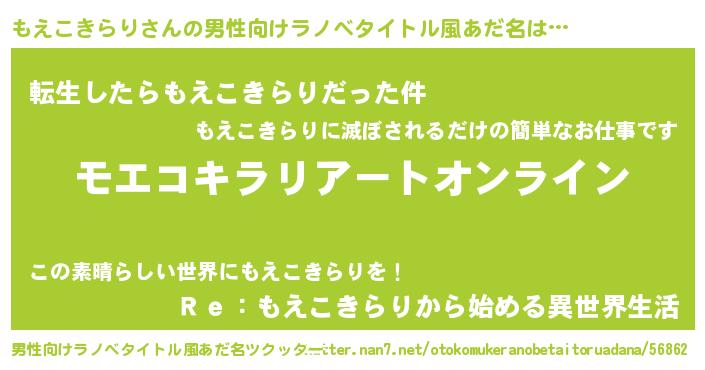 | 女子向けラノベタイトル風あだ名 | 『誰かこのもえこきらりを説明してください! ~契約から始まるウェディング~』 |