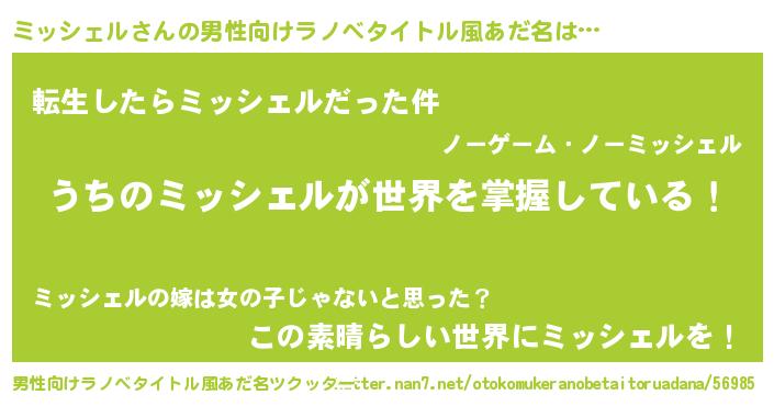 | 胡散臭い通販商品みたいなあだ名 | 『あなたにだけ特別に提供する限定10本のレアな日本酒…その名も「ミッシェル」』 |