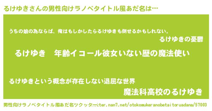 | 女子向けラノベタイトル風あだ名 | 『るけゆきの玉の輿計画!』 |