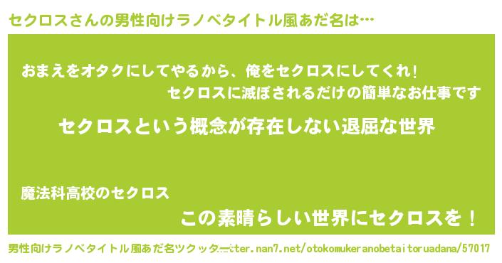 | ヒーロー風カッコイイあだ名 | 『ネオセクロス』『正義の使者セクロス』 |