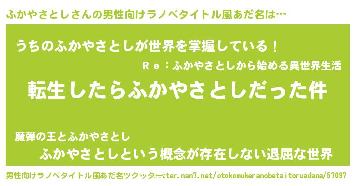 | 女子向けラノベタイトル風あだ名 | 『婚約破棄系悪役ふかやさとしに転生したので、保身に走りました。』 |