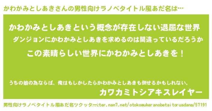 | 胡散臭い通販商品みたいなあだ名 | 『世界中を虜にした世界で10本だけ現存している希少なブランデー…その名も「かわかみとしあき」』 |
