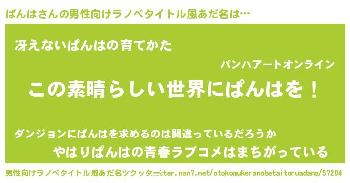 | 胡散臭い通販商品みたいなあだ名 | 『あなたにだけ特別に提供する100年もののヴィンテージワイン…その名も「ぱんは」』 |