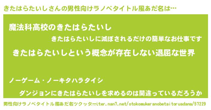 | 女子向けラノベタイトル風あだ名 | 『異世界で失敗しない100のきたはらたいし』 |