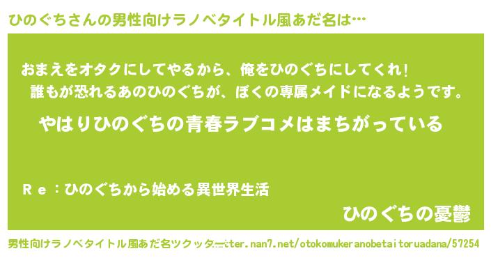 | 女子向けラノベタイトル風あだ名 | 『ひのぐちの雑貨屋さん』『闇のひのぐち』 |