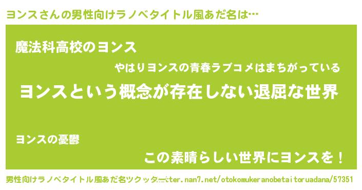 | 胡散臭い通販商品みたいなあだ名 | 『来世でも幸せになれる水素水…その名も「ヨンス」』 |