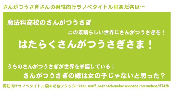 | 胡散臭い通販商品みたいなあだ名 | 『ガンによく効く高麗人参…その名も「さんがつうさぎ」』 |