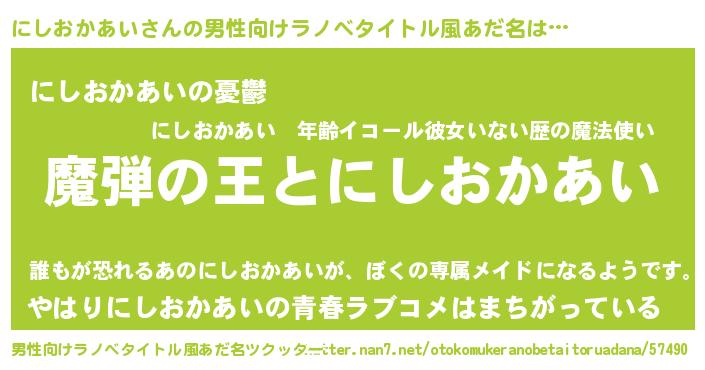 | 女子向けラノベタイトル風あだ名 | 『にしおかあいが死なない童話 林檎のにしおかあいの診療簿』 |