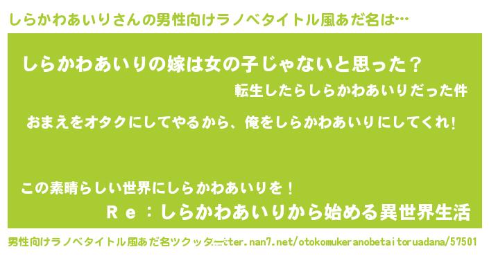 | 女子向けラノベタイトル風あだ名 | 『しらかわあいり夫妻のなれそめ』 |