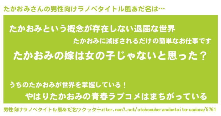 | 女子向けラノベタイトル風あだ名 | 『たかおみの卵を拾いまして』 |