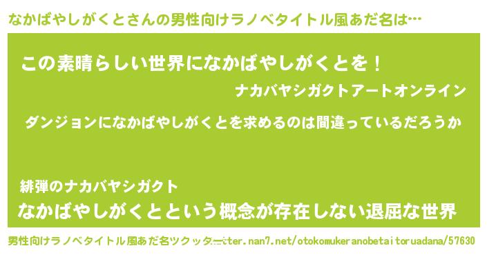 | 女子向けラノベタイトル風あだ名 | 『なかばやしがくとの卵を拾いまして』 |