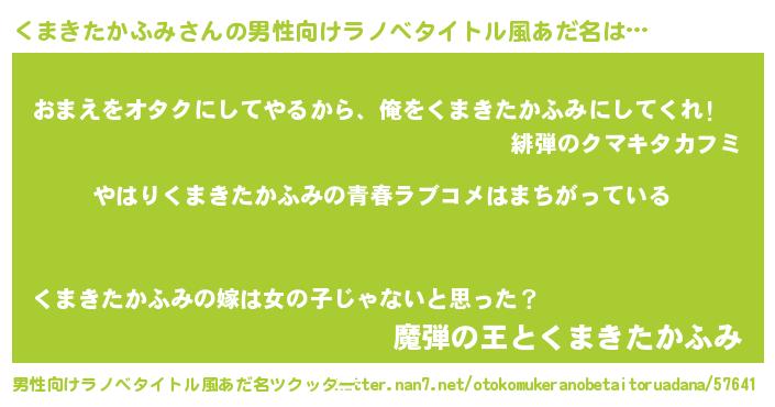 | 女子向けラノベタイトル風あだ名 | 『くまきたかふみ伯爵の花嫁』 |