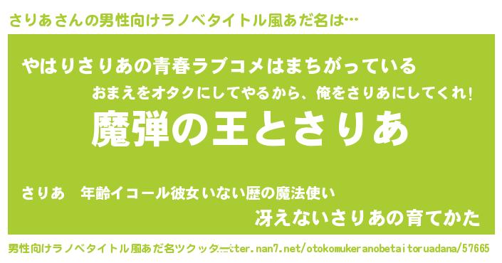 | 女子向けラノベタイトル風あだ名 | 『乙女ゲームの破滅フラグしかない悪役さりあに転生してしまった…』 |
