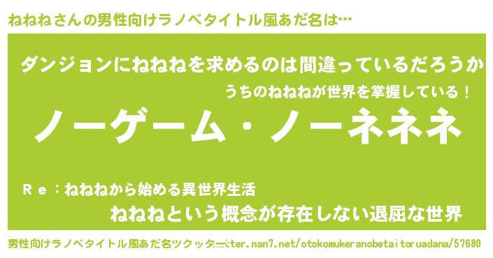 | 女子向けラノベタイトル風あだ名 | 『死神ねねねの再婚』 |