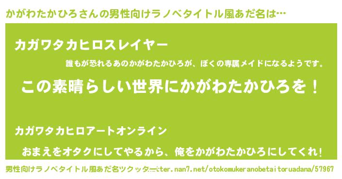 | ヘコむあだ名 | 『かがわたかひろ(苦笑)』『かがふぇ~』 |