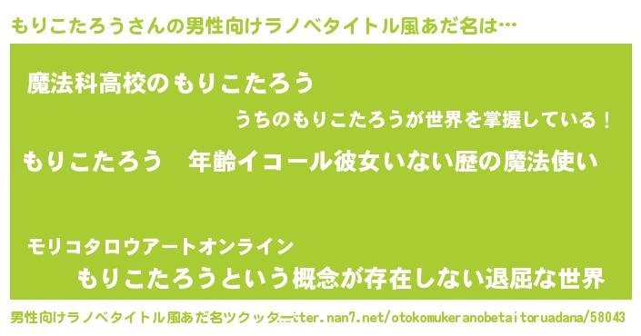 | 女子向けラノベタイトル風あだ名 | 『もりこたろうの玉の輿計画!』 |