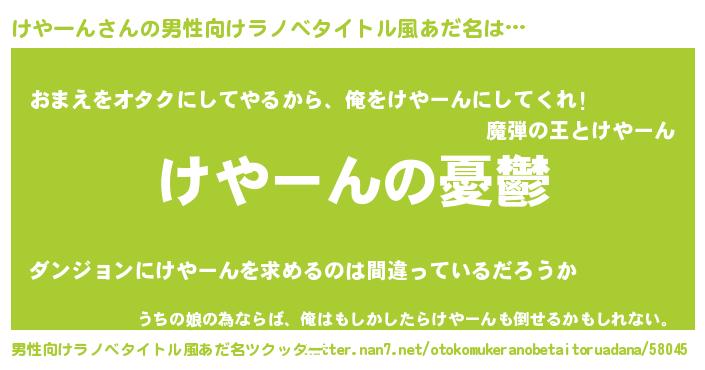 | 女子向けラノベタイトル風あだ名 | 『(仮)けやーんのやんごとなき事情』 |