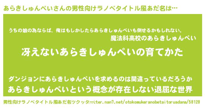 女子向けラノベタイトル風あだ名 | 『シンデレラあらきしゅんぺい家の靴箱館』 |