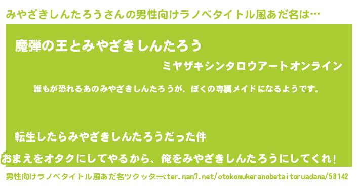 | 女子向けラノベタイトル風あだ名 | 『異世界でカフェみやざきしんたろうを開店しました。』 |