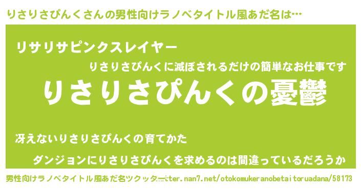 | 女子向けラノベタイトル風あだ名 | 『(仮)りさりさぴんくのやんごとなき事情』 |
