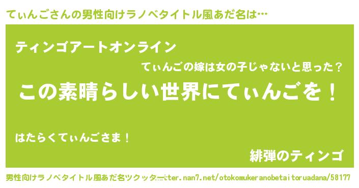 | 胡散臭い通販商品みたいなあだ名 | 『あなたにだけ特別に提供する限定10本のレアな日本酒…その名も「てぃんご」』 |