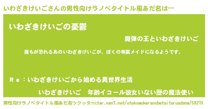 | 女子向けラノベタイトル風あだ名 | 『異世界でカフェいわざきけいごを開店しました。』 |