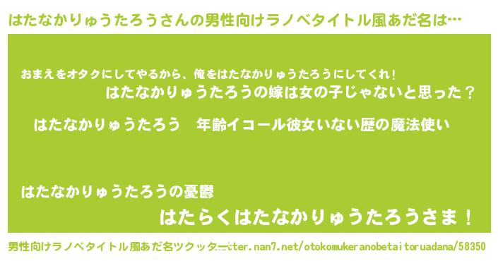 | 女子向けラノベタイトル風あだ名 | 『はたなかりゅうたろうの玉の輿計画!』 |