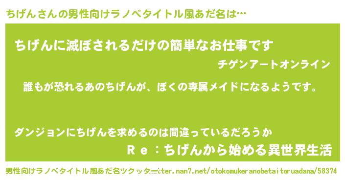 | 女子向けラノベタイトル風あだ名 | 『ちげんの契約王妃』『闇のちげん』 |