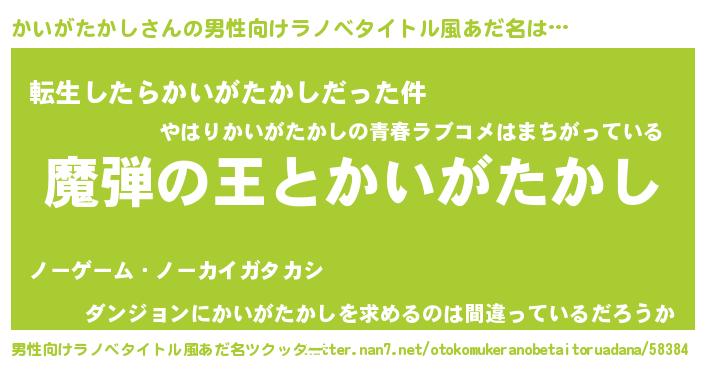 | 女子向けラノベタイトル風あだ名 | 『かいがたかしが死なない童話 林檎のかいがたかしの診療簿』 |