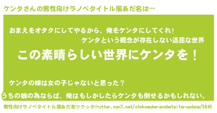 | 女子向けラノベタイトル風あだ名 | 『悪役ケンタに転生したようですが、知った事ではありません』 |