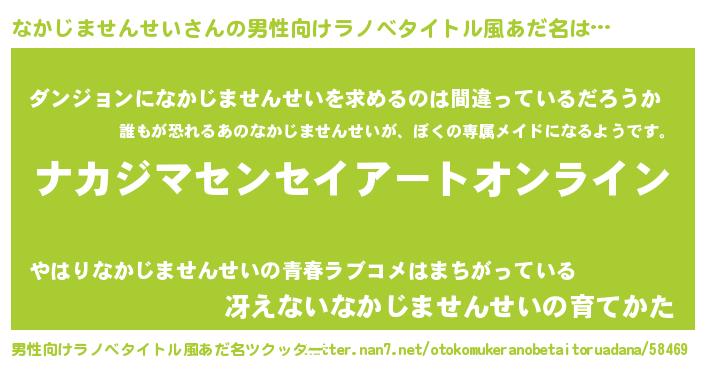 | 女子向けラノベタイトル風あだ名 | 『なかじませんせい姫と円卓の騎士』 |