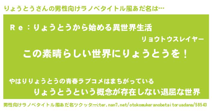 | ヒーロー風カッコイイあだ名 | 『仮面リョダー』『究極戦士リョウトウ』 |
