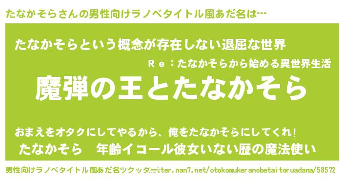 | 女子向けラノベタイトル風あだ名 | 『乙女ゲームの破滅フラグしかない悪役たなかそらに転生してしまった…』 |