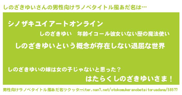 | 女子向けラノベタイトル風あだ名 | 『異世界で失敗しない100のしのざきゆい』 |