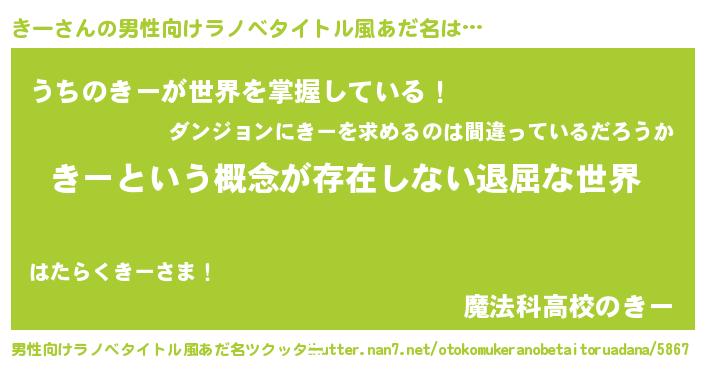 | 女子向けラノベタイトル風あだ名 | 『異世界で失敗しない100のきー』 |