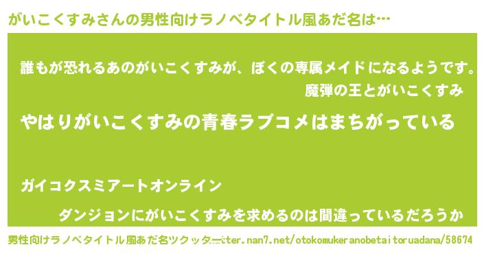 | 女子向けラノベタイトル風あだ名 | 『がいこくすみの雑貨屋さん』 |