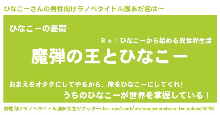 | 女子向けラノベタイトル風あだ名 | 『ひなこーが死なない童話 林檎のひなこーの診療簿』 |