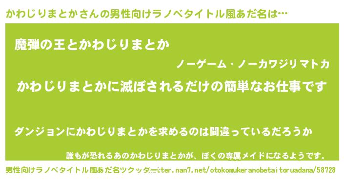 | 胡散臭い通販商品みたいなあだ名 | 『あなたにだけ特別に提供する限定10本のレアな日本酒…その名も「かわじりまとか」』 |