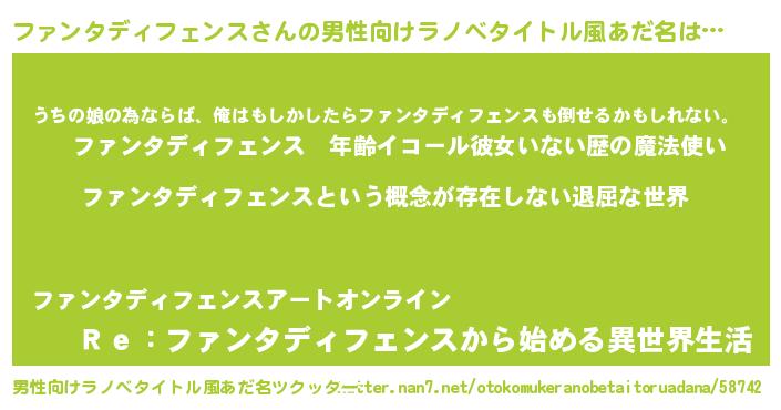 | 胡散臭い通販商品みたいなあだ名 | 『来世でも幸せになれる水素水…その名も「ファンタディフェンス」』 |