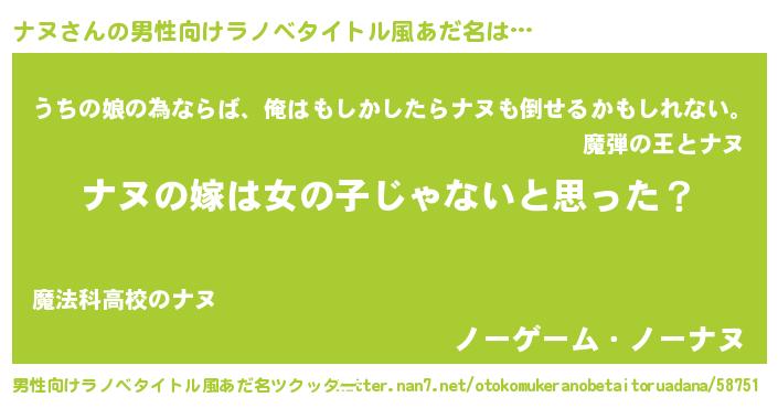 | 女子向けラノベタイトル風あだ名 | 『ナヌの卵を拾いまして』 |