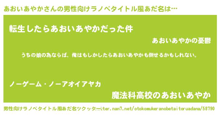 | 女子向けラノベタイトル風あだ名 | 『あおいあやか伯爵の花嫁』 |