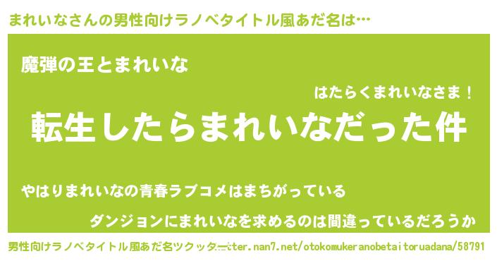 | 女子向けラノベタイトル風あだ名 | 『婚約破棄系悪役まれいなに転生したので、保身に走りました。』 |
