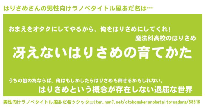 | 女子向けラノベタイトル風あだ名 | 『シンデレラはりさめ家の靴箱館』 |