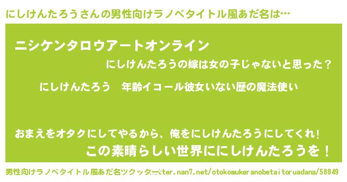 | 女子向けラノベタイトル風あだ名 | 『にしけんたろうの玉の輿計画!』 |