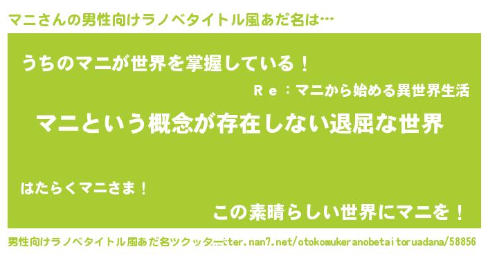| 女子向けラノベタイトル風あだ名 | 『異世界で失敗しない100のマニ』 |