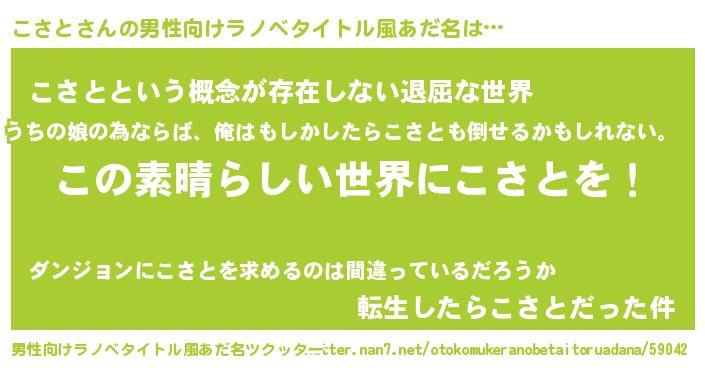 | 胡散臭い通販商品みたいなあだ名 | 『あなたにだけ特別に提供する100年もののヴィンテージワイン…その名も「こさと」』 |