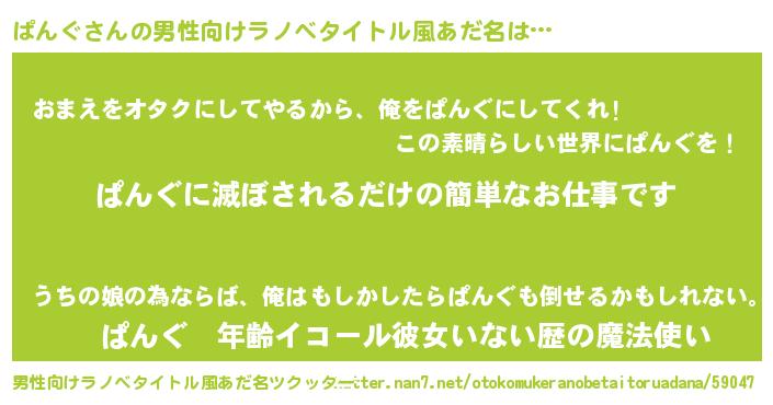 | ヒーロー風カッコイイあだ名 | 『慈愛の使者ぱんぐ』『仮面パンダー』 |