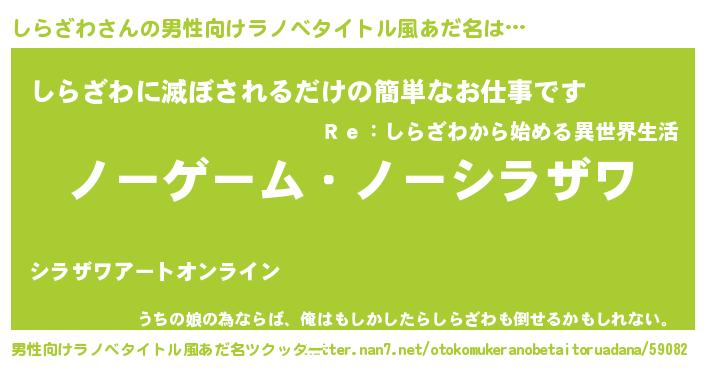 | 女子向けラノベタイトル風あだ名 | 『死神しらざわの再婚』 |