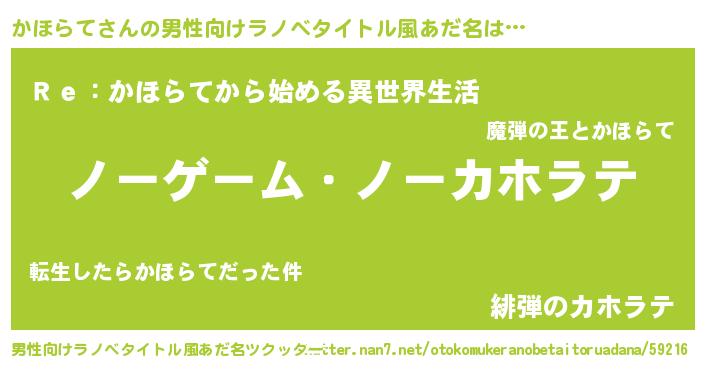 | 女子向けラノベタイトル風あだ名 | 『死神かほらての再婚』『闇のかほらて』 |