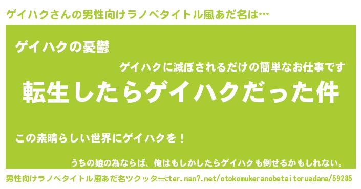 | 女子向けラノベタイトル風あだ名 | 『ゲイハクの玉の輿計画!』 |